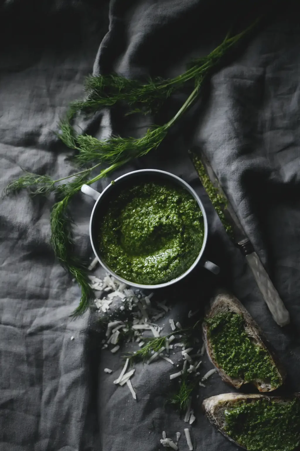 Sekoita kaikki peston ainekset tehosekoittimessa tai sauvasekoittimella tasaiseksi. Pesto sopii erinomaisesti niin pastan ja kalan seuraksi kuin leivänkin päällä nautittavaksi.